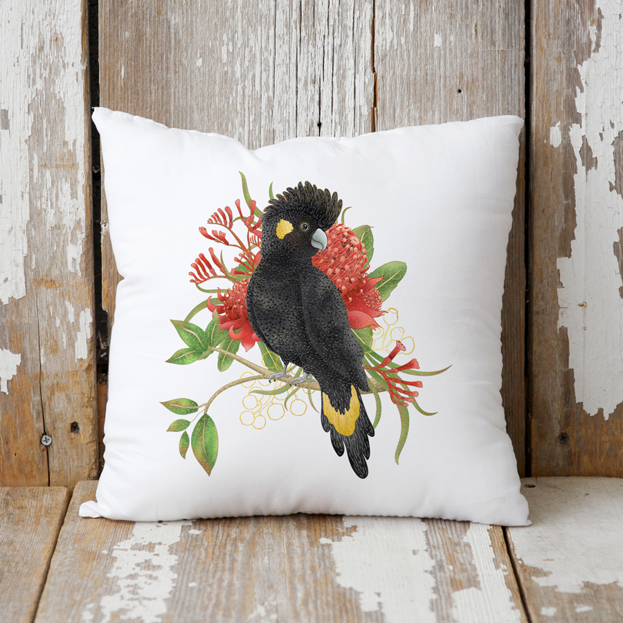 Cushion featuring a Yellow-tailed Black Cockatoo.