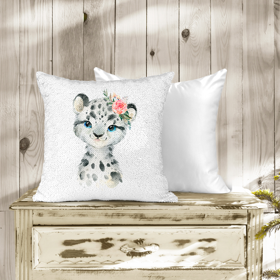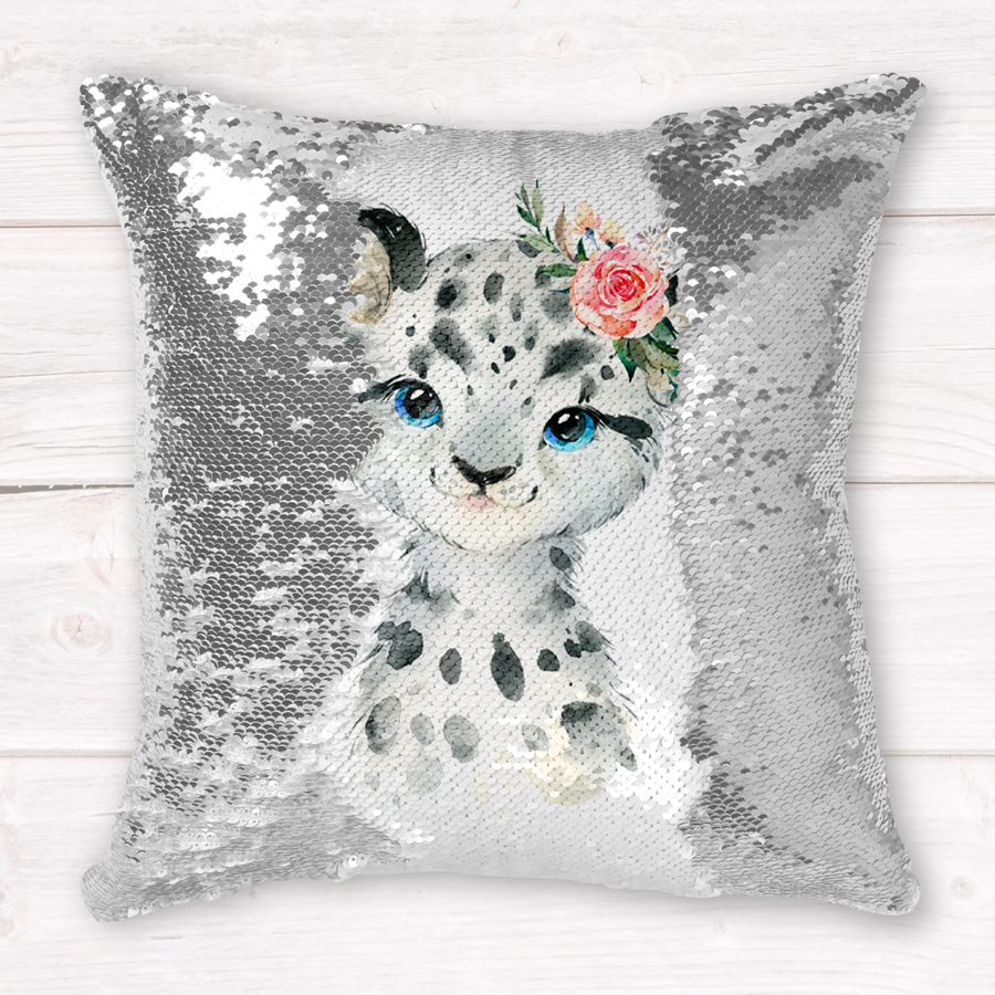 Personalised Baby Snow Leopard with Bouquet Sequin Cushion Cover Personalised Baby Snow Leopard with Bouquet Sequin Cushion Cover