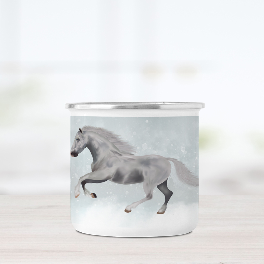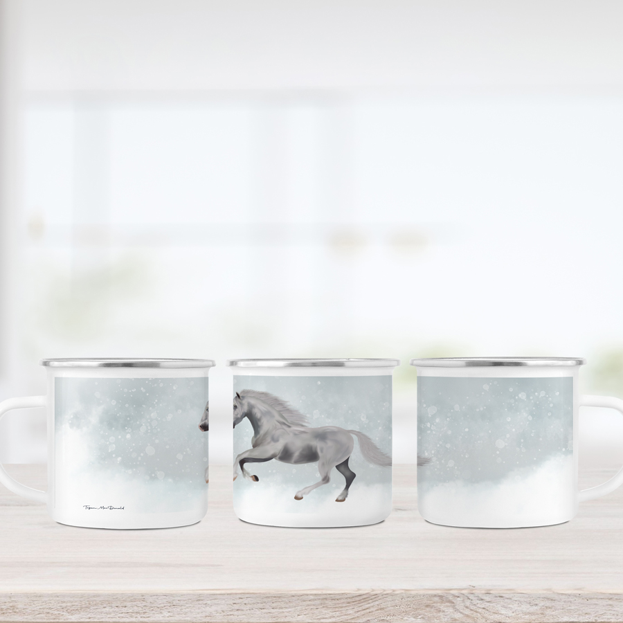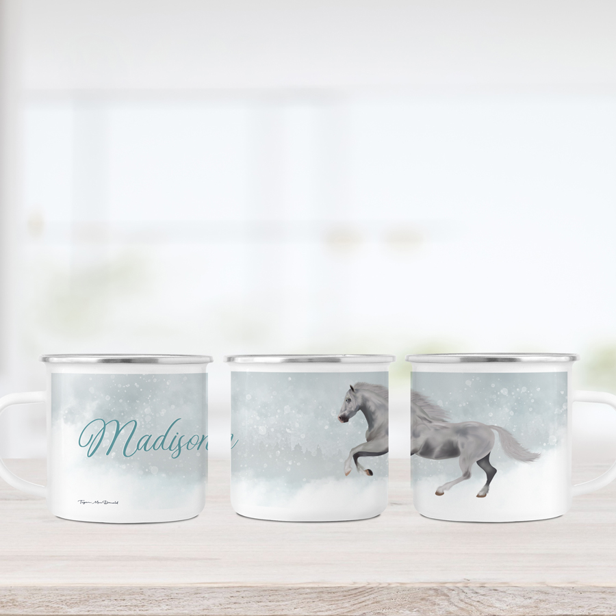Add some winter magic to your morning coffee with this beautiful personalised enamel mug. Featuring a striking silver horse against a snow-dusted landscape, this lovely design captures the peacefulness of a quiet, foggy morning. Perfect for everyday use – at home, camping, bushwalking or other outdoor activities – this mug makes an ideal gift for any occasion.
