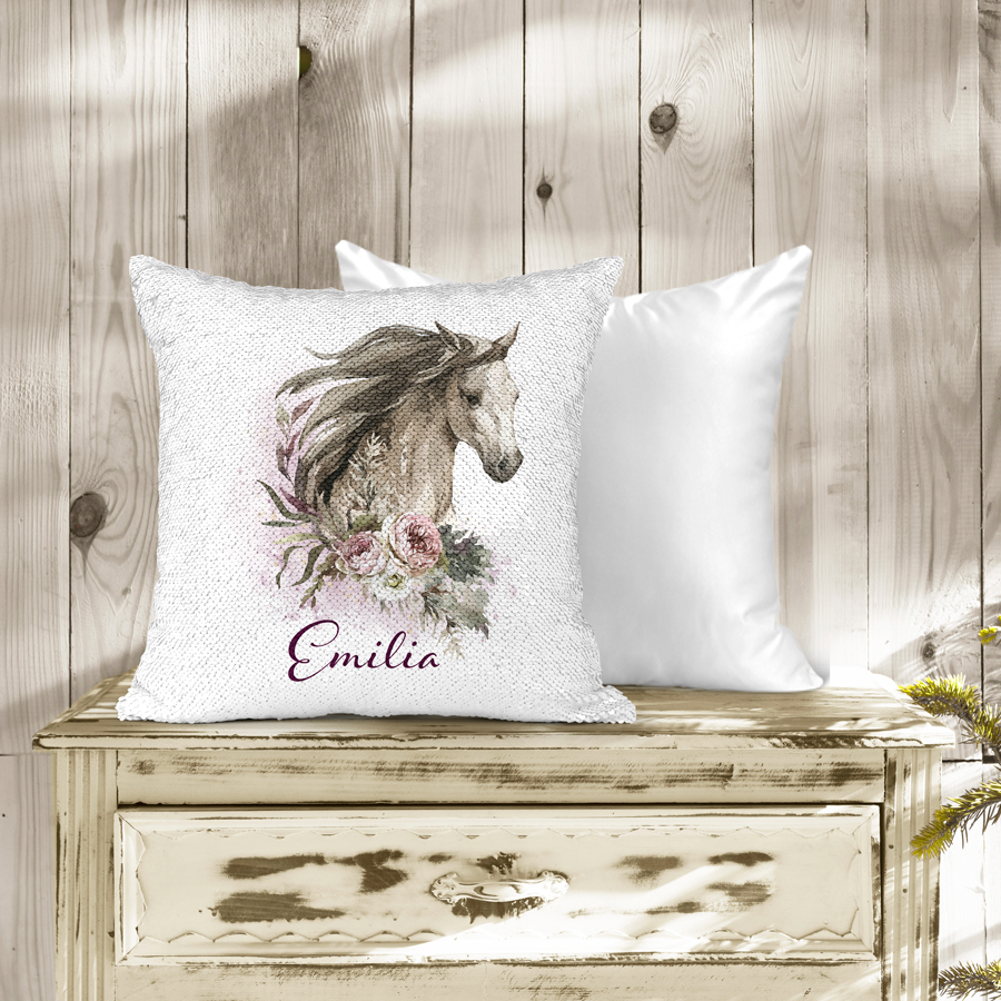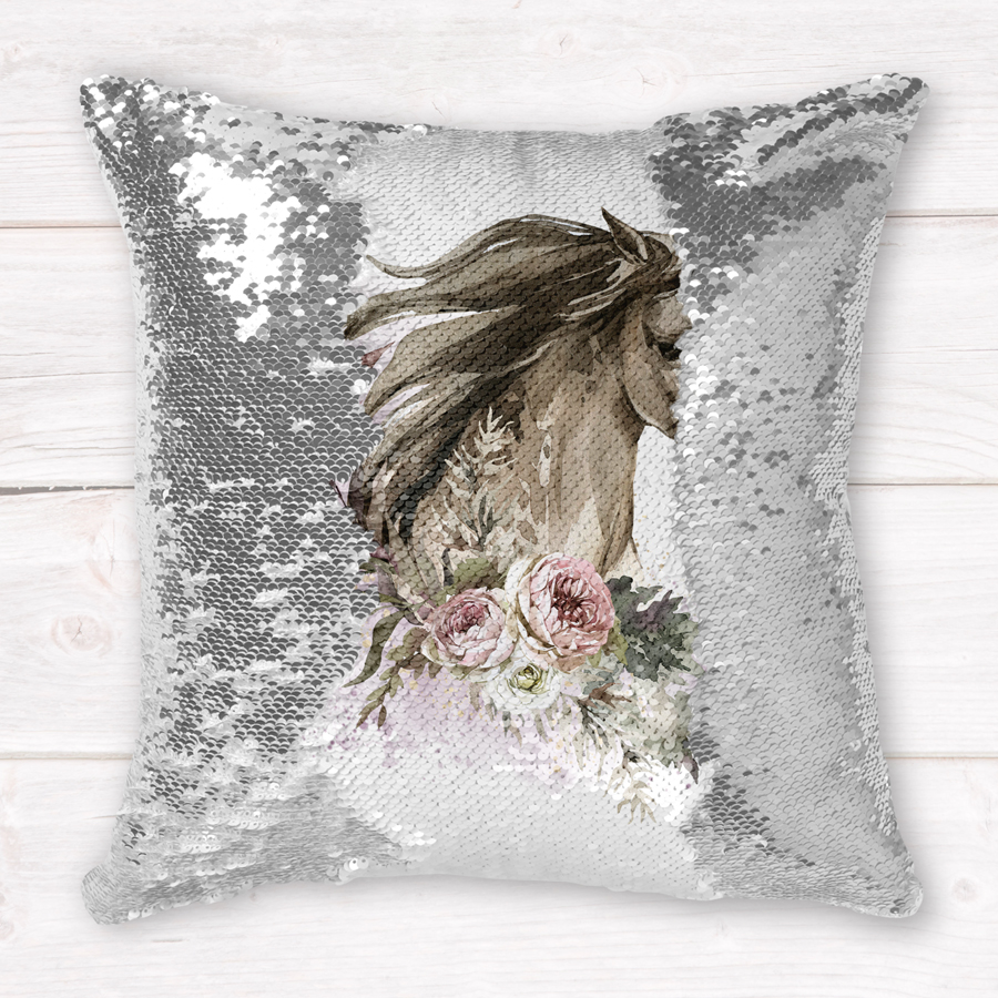 Make bedtime extra fun with this magical personalised horse sequin cushion cover! Perfect for birthdays and special surprises, it will add sparkle to any room. The image is printed onto shimmering white sequins and with a simple swipe of the hand, shiny silver sequins are revealed, hiding the design – magic!