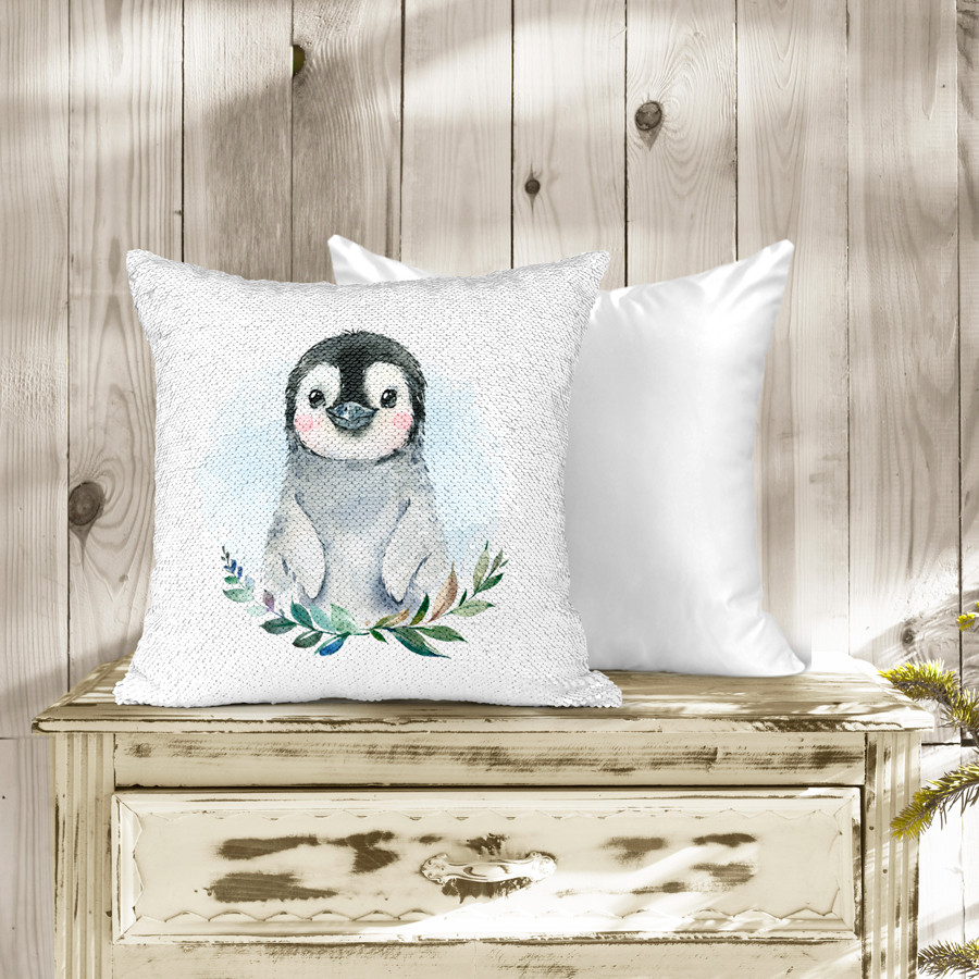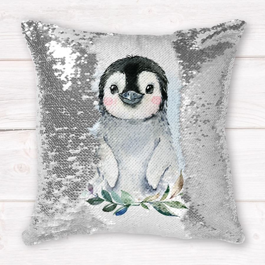 Kids personalised sequin cushion featuring a cute illustrated penguin.