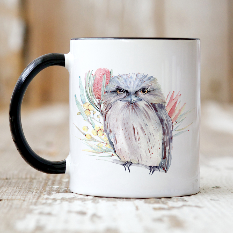 Enjoy your beverage of choice in this cute frogmouth mug. Add customised text to make a great gift for family or friends. The design is sublimated on both sides using high quality inks, giving a vibrant print that won’t fade, peel or crack.